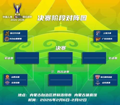 今天下午,CBA联赛官方也发布了本届CBA俱乐部杯决赛阶段的竞赛日程。上海久事男篮将在2月6日晚间对战广东东阳光男篮。