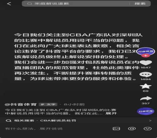 1月7日晚,抖音体育官方账号在社交平台发文称,关注到CBA广东队对深圳队的比赛中解说员用词不当的问题,在此向广大球迷表达歉意,相关言论违背了抖音平台的要求,已对该解说员做终止解说安排的处理。