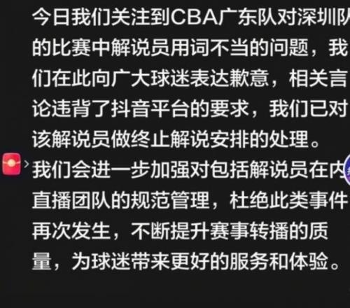 果然也有了效果,赛后某音平台官方道歉,对于该解说员予以终止解说的安排,并要求会进一步加强对包括解说员在内直播团队的规范管理,杜绝此类事件再次发生,不断提升赛事转播的质量,为球迷带来更好的服务和体验。