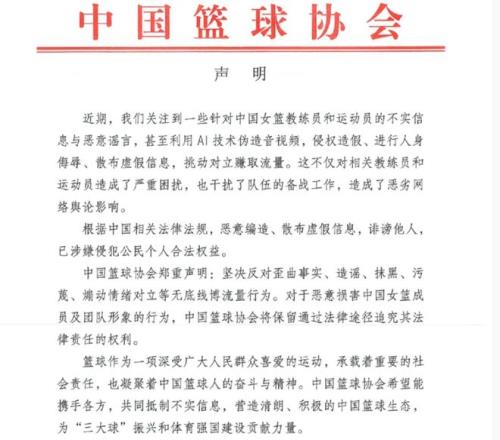 值得一提的是,在刚刚,中国篮协也是针对此事,发布了一则严正声明。声明中表示:近期,有一些人利用AI技术伪造视频,针对中国女篮球员、教练员传播一些不实信息,甚至是恶意谣言,通过散布虚假信息,挑动对立,来进行赚取流量……这种现象对球队造成了非常恶劣网络舆论影响!