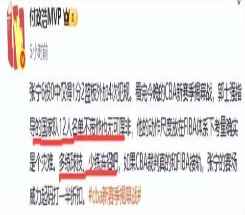 赛后山西一名队员遭到名记付政浩的点名批评。没错,他就是拿着600万年薪的张宁,从他的表现看,严重不适应FIBA体系下40分钟的比赛,这个体系下的比赛,犯规多就是灾难。张宁仅打了一节多就三次犯规,所以他只能下来坐板凳。不过全场他也打了20分钟,这个时间也不少了,是山西队出场时间第三多队员。但在20分钟内6投0中,4次犯规,仅通过罚球捡了1分,这数据完全对不起自己年薪。他那些大动作的犯规,以及投篮劈腿的动作更是遭到媒体人付政浩的批评。