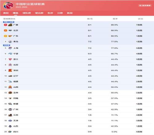 本轮其他比赛中,浙江队爆冷击败青岛队,以4胜5负的战绩悄然升至第七,成为季后赛席位的有力竞争者。而辽宁队则遭遇连败,排名跌至第十,跌出前八行列。黑马青岛队虽然输给浙江,但仍以7胜2负的战绩排在第四,成绩喜人,上海队同样战绩紧随其后。