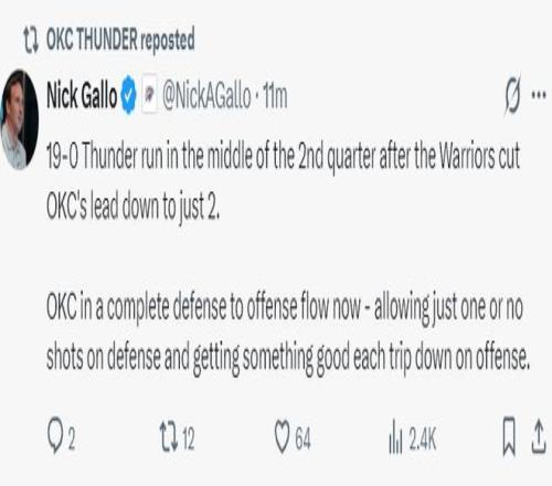 首节开场雷霆是一波17-7的进攻高潮,亚历山大首节9中4+三分2中1拿到12分3助攻,杰威6分4篮板,霍姆格伦4分4篮板,雷霆三巨头的发挥都不错,雷霆首节就已经领先11分之多,也因为领先太多,次节开场打了5分钟勇士将分差缩小到2分。
