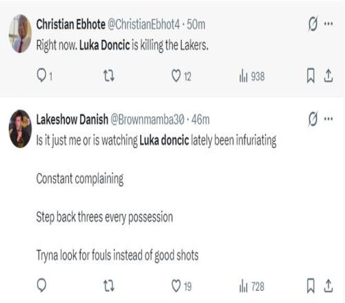 湖人球迷:感觉东契奇把球队打得满地找牙,看他的比赛令人非常恼火,除了抱怨裁判就是浪投,每一次的突破出手都想去造犯规而不是争取投篮得分。