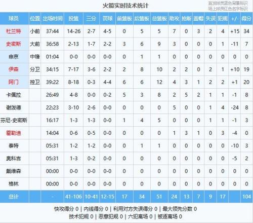 杜兰特34分5板7助3帽、阿门20分12板4助3断、伊森19分10板2助2断、卡佩拉8分8板2助5断2帽、谢泼德8分5助、史密斯7分9板3助、芬尼-史密斯3分5板