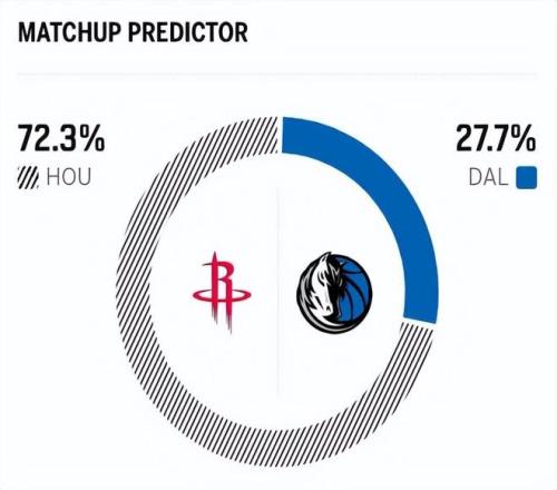 赛前,美媒ESPN对本场比赛进行了胜率预测,火箭队胜率依旧高达72.3%,占据绝对上风,独行侠胜率则仅有27.7% 。