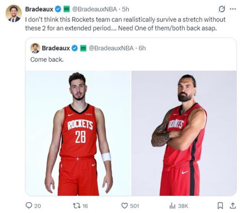 亚当斯自12月30日后就因为脚踝伤势进入伤病名单,火箭记者Bradeaux写道:我认为火箭若长期缺少这两位球员,恐怕很难撑下去,急需阿尔佩伦-申京和史蒂文-亚当斯其中一人/两人尽快归队。