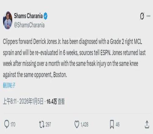 北京时间1月5日上午,据NBA名记Shams报道,快船前锋小德里克-琼斯被诊断为右膝内侧副韧带二级扭伤,将在6周后接受复查。这已经是琼斯本赛季第二次遭遇右膝伤势了,上周他刚刚复出,如今又一次因膝伤休战。