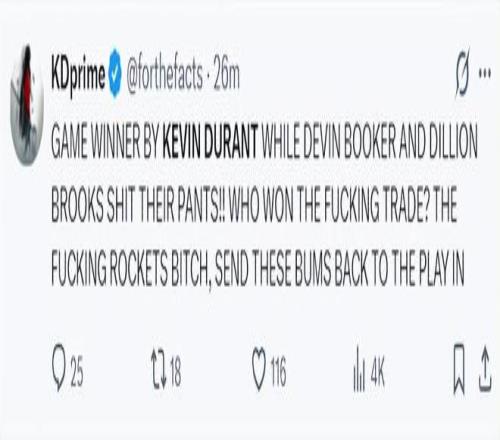 4.杜兰特成为一锤定音的那个人,而布克、狄龙被打得满地找牙。火箭与太阳的交易谁是赢家谁是输家一目了然,把那些该死的家伙送回去吧。