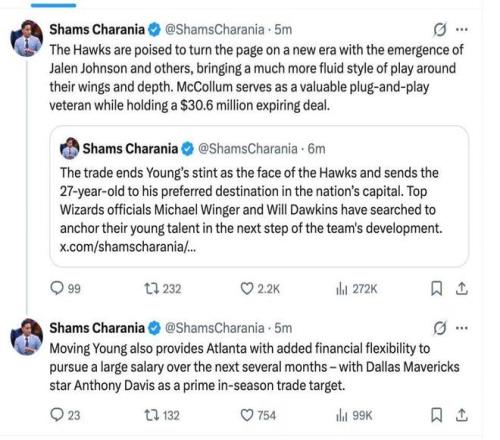 老鹰正迎来新时代,杰伦-约翰逊等新星崛起,球队将围绕侧翼球员去打造深度阵容,他们展现出更加流畅的比赛风格。在特雷-杨本赛季出战的比赛,老鹰胜少负多,他已经与杰伦-约翰逊不兼容,因而离队不出意外。