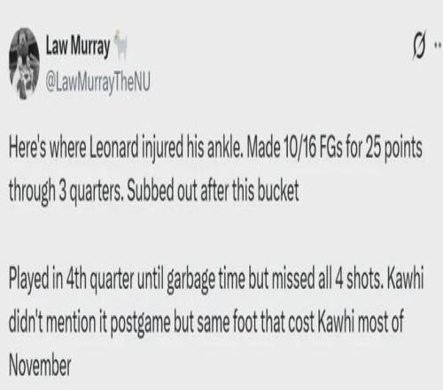 据快船队记Law Murray表示,伦纳德这次受伤的右脚与11月份受伤的是同一只脚(11月总共缺阵10场)......难道又要高挂免战牌的节奏?