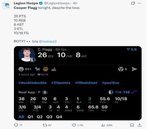 库珀-弗拉格是独行侠唯一的非卖品,他本场比赛的个人表现是非常出色的,全场比赛38分钟,18中10,三分6中3,罚球4中3,拿到26分10篮板8助攻3抢断1盖帽,命中率55.6%,三分命中率50%,弗拉格的个人表现没有受到外界的流言侵扰,因为不管球队怎么变他都是未来的建队基石。