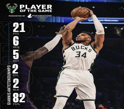 雄鹿队,小波特14中7砍下了22分5板6助4断,得分和抢断领跑全场,在攻防两端发力。库兹马10中5得到13分3板2助、波蒂斯12中5,三分球5中1得到11分12板3助、AJ·格林7中4贡献11分2板2助2断。罗林斯13中2,三分球7中1得到10分6板2助,在进攻端疯狂打铁。特纳8分6板、特伦特6分2板2助、哈里斯3分2板1助。