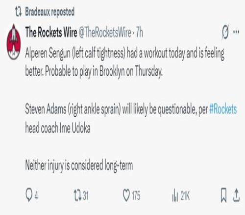 乌度卡在训练后的采访说道:申京的左腿肌肉紧张已经没有大碍,今天进行了训练感觉好多了,大概率在对阵篮网的比赛中会复出。亚当斯右脚踝的伤势还不明确但不是长期的伤势。(火箭下一场是2月2日还有两天的休息时间)