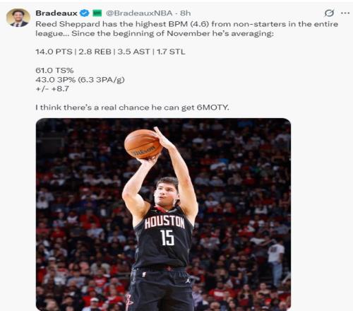 他还表示谢泼德自11月以来,他是非先发BPM最高(4.6)的球员,场均拿到14分2.8篮板3.5助攻1.7抢断,真实命中率61%,三分命中率43%,正负值+8.7,谢泼德是最佳第六人的有力争夺者。