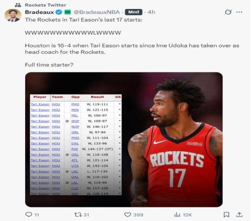 伊森登场先发的17场比赛拿到了16胜1负的战绩,自乌度卡时期伊森先发的比赛火箭队是16胜4负,所以伊森打先发也算是火箭的一个妙招、奇招。