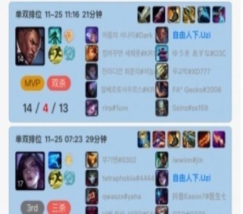 电竞体育11月29报道 根据排位统计小程序显示,Uzi在25日之后就未登上韩服账号。