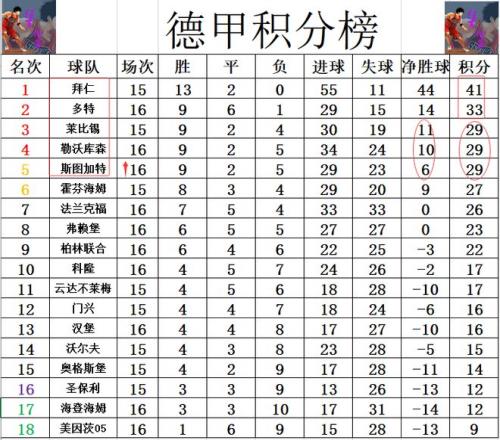 积分榜方面,拜仁13胜2平继续保持不败,少赛1场领先多特8分高居榜首。勒沃库森惨败后,净胜球少了莱比锡1个“自动”跌出前3,莱比锡躺进前3,斯图加特大胜后追了上来,净胜球劣势排在第5。