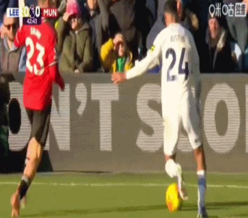 第45分钟,双方拼抢,贾斯廷倒地后顺势踢到了卢克-肖的屁股