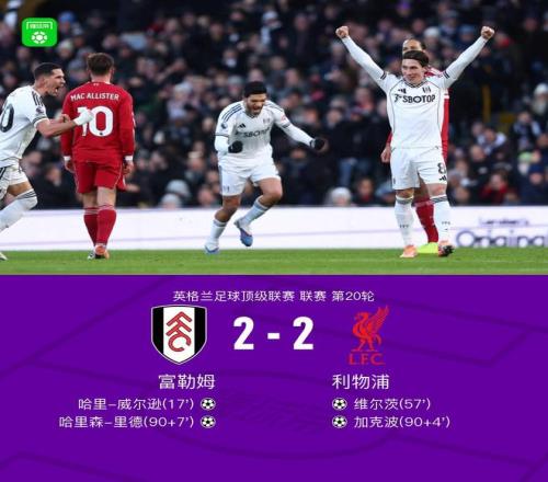 北京时间1月4日,英超联赛第20轮,富勒姆坐镇主场迎战利物浦。上半场,劳尔-希门尼斯助攻,哈里-威尔逊反越位破门先拔头筹;下半场,维尔茨疑似越位位置的进球经VAR认定有效,尾声阶段比赛进入高潮,加克波在禁区内推射破门反超比分,但哈里森-里德世界波破门迅速还以颜色。最终,利物浦客场2-2战平富勒姆。
