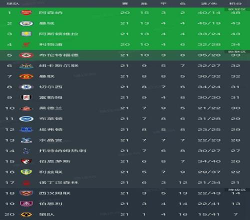 英超最新积分榜