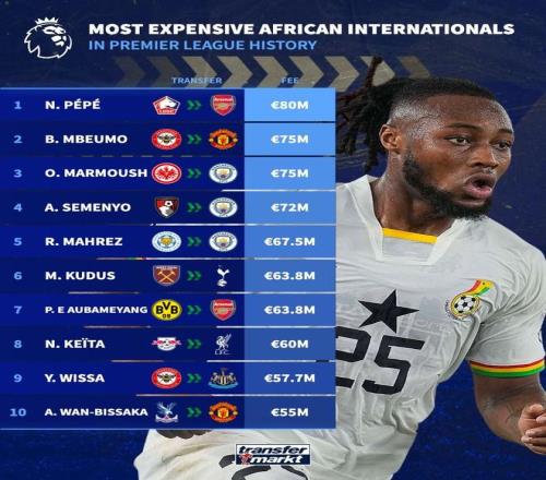 曼城从伯恩茅斯签下加纳前锋塞门约,据悉转会费为7200万欧,据德转统计,塞门约是英超历史上转会费第四高的非洲国脚。