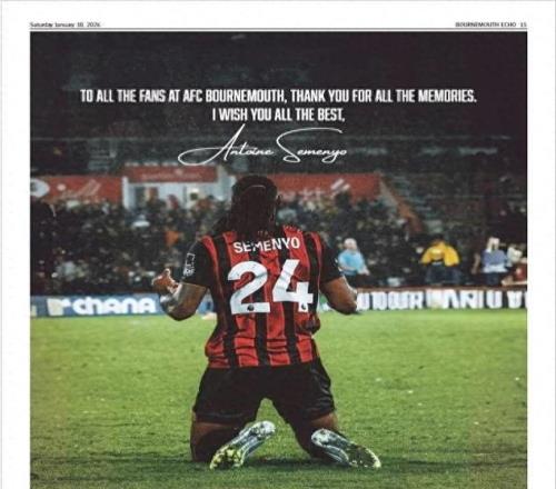 尽管数字媒体盛行,但传统报纸的魅力依然不减。伯恩茅斯前锋安东尼·塞梅尼奥就通过在《伯恩茅斯回声报》上刊登广告的方式,向“樱桃军团”的球迷们表达了他的感激之情。这位刚刚以6250万英镑天价转会至曼城的球星,因其在转会期间的得体举止而广受赞誉。