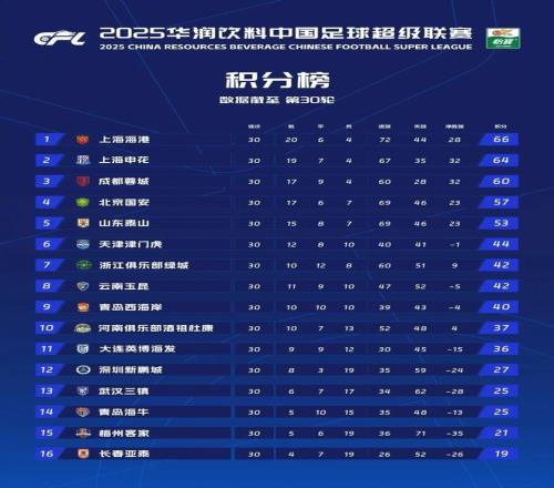 2025中超结局:海港力压申花获3连冠亚泰梅州告别